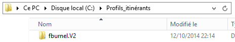 Depuis une machine cliente, connectez-vous avec un compte pour lequel le profil itinérant est configuré. Sur le serveur, dans le répertoire partagé, vous verrez apparaître un dossier de profil pour cet utilisateur, comme ici : guy.mauve.V6.