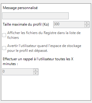 Ce paramètre permet de déterminer une taille maximale pour le profil d'un utilisateur et comment le système doit se comporter lorsque cette limite est atteinte. Vous pouvez indiquer une taille en Ko, indiquer si les fichiers du Registre sont comptabilisés dans la taille, mais aussi, indiquer si vous souhaitez ou non avertir l'utilisateur lorsque la taille est dépassée.