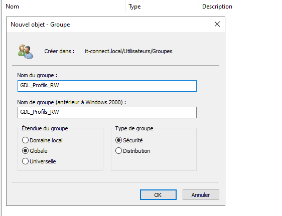 La première étape consiste à créer un groupe de sécurité qui aura les permissions de lecture et d'écriture sur le dossier des profils. Ici, le groupe créé avec l'étendue Domaine local est nommé ainsi : GDL_Profils_RW. À l'intérieur, il faudra ajouter d'autres groupes (ou les utilisateurs) qui doivent pouvoir créer un dossier de profil.