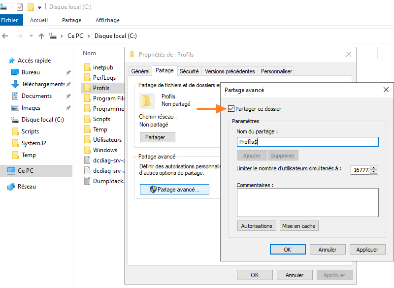 Pour cette démonstration, les profils itinérants seront stockés sur le serveur SRV-ADDS-01 au sein de la partition "C" dans un dossier partagé nommé "Profils". En production, vous ne devez pas procéder de cette façon : utilisez un serveur qui n'est pas contrôleur de domaine et stockez les profils sur un volume distinct. Ce qui ne vous empêche pas d'appliquer la méthode décrite ci-dessous, elle reste la même.