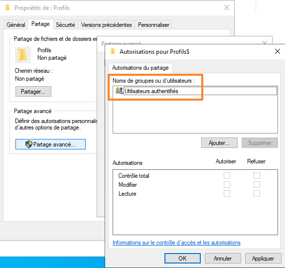 Cliquez sur le bouton "Autorisations" pour définir les permissions de partage. Supprimez "Tout le monde" et ajoutez "Utilisateurs authentifiés" avec des droits de lecture et d'écriture.