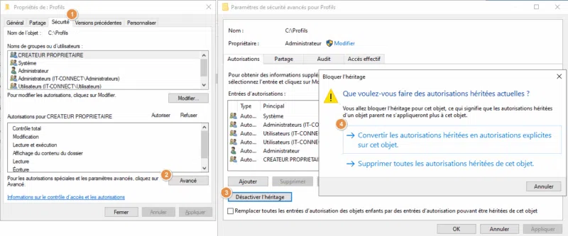 Cliquez ensuite sur l'onglet "Sécurité", puis sur "Avancé" afin de gérer les autorisations NTFS. Désactivez l'héritage en cliquant sur le bouton portant cet intitulé, puis choisissez de convertir les autorisations héritées.
