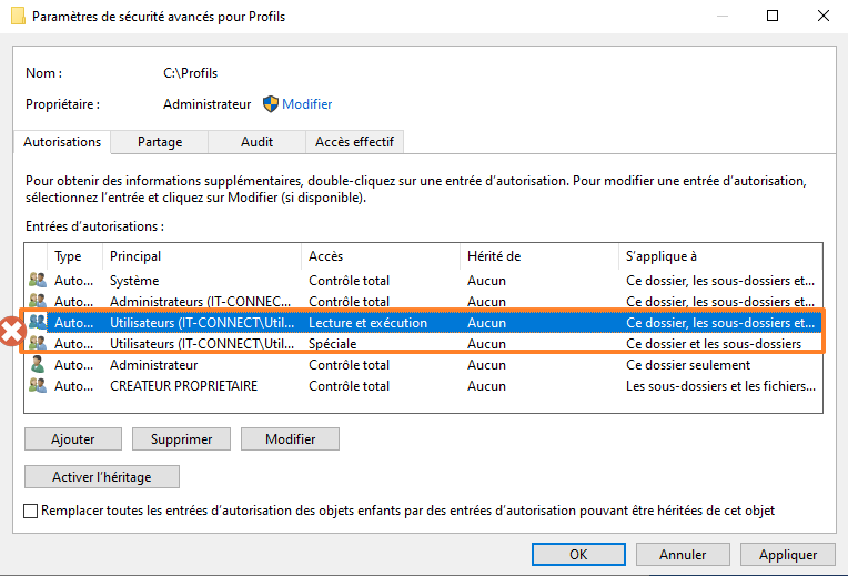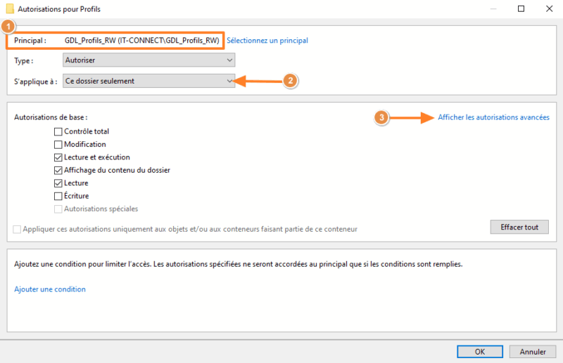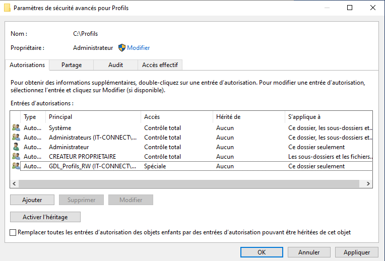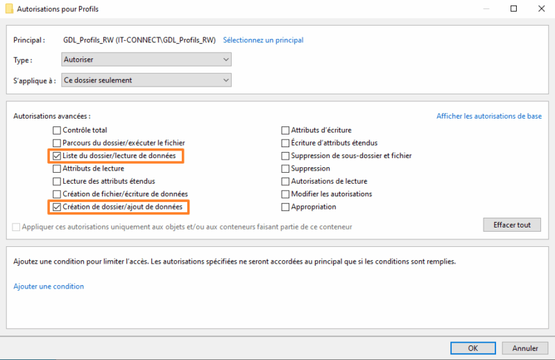 Puis, ajoutez une nouvelle autorisation. Nous allons définir des droits spécifiques pour que les utilisateurs puissent créer leur dossier de profil itinérant lors de la première connexion (c'est automatique) sans pour autant avoir des droits sur les dossiers de profil des autres utilisateurs. Le cloisonnement est important pour assurer la sécurité des données.