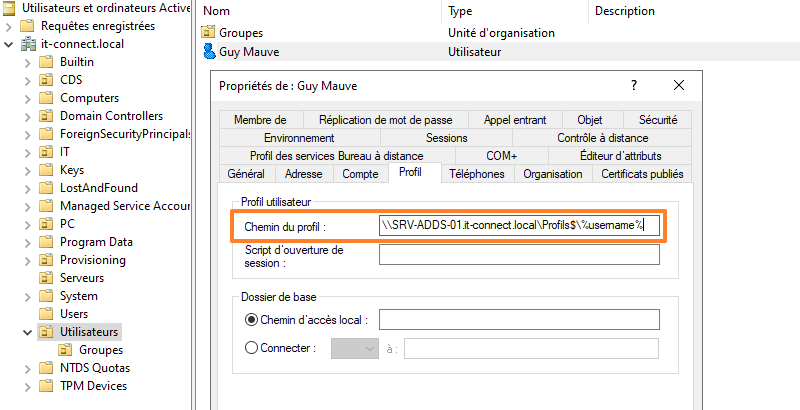Dans l’objet utilisateur AD, onglet « Profil », champ « Chemin du profil », renseignez un UNC comme \\srv-fichiers.it-connect.local\Profils$\%username%. Le serveur héberge un dossier "Profils", partagé, et la variable %username% permet de créer un sous-dossier spécifique. Ainsi, chaque utilisateur dispose d'un profil personnel et privé.