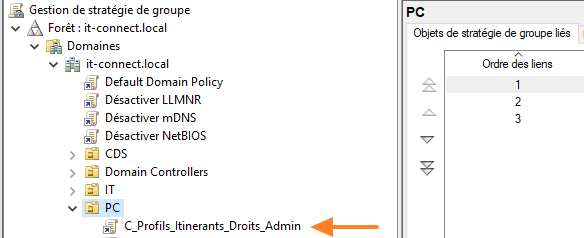 Vous devez lier la stratégie de groupe à l'unité d'organisation qui contient les ordinateurs qui auront un profil itinérant. Par exemple :