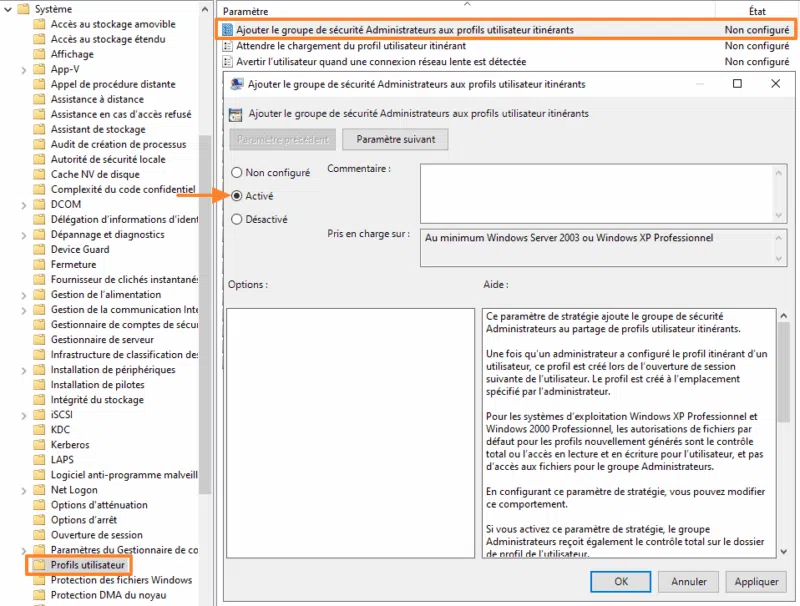 Ici, vous devez activer le paramètre intitulé "Ajouter le groupe de sécurité Administrateurs aux profils utilisateur itinérants".