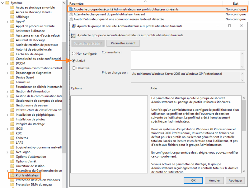 Ici, vous devez activer le paramètre intitulé "Ajouter le groupe de sécurité Administrateurs aux profils utilisateur itinérants".