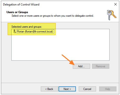 Ajoutez le compte utilisateur pour lequel vous souhaitez ajouter l'autorisation, ou autrement dit, déléguer le droit. Il est tout à fait possible d'utiliser un groupe de sécurité.