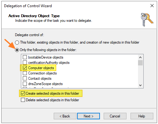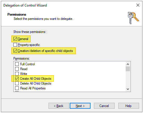 Au niveau des permissions à déléguer, il est nécessaire de cocher "General" et "Creation/deletion of specific child objects", puis la permission "Create All Child Objects".