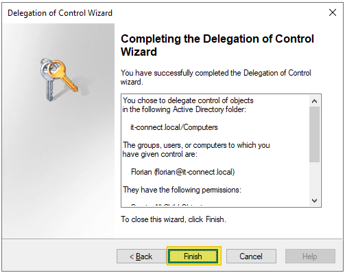 Note : la délégation doit être réalisée sur chacune des OU au sein desquels l'utilisateur doit pouvoir créer des objets ordinateurs. Il faut être le plus précis et le plus restrictif possible par mesure de sécurité.
