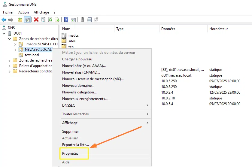 2 - Effectuez un clic droit sur la zone DNS concernée (ex : corp.local) > Propriétés.