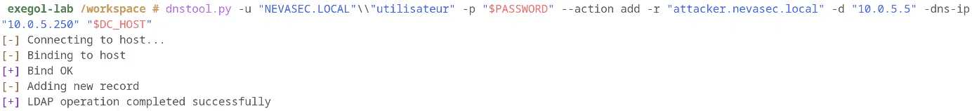 Si ce droit est présent, n’importe quel utilisateur peut créer un enregistrement DNS manuellement. Pas encore convaincu ? Regardez la capture ci-dessous où un enregistrement DNS est créé en utilisant l’outil dnstool.
