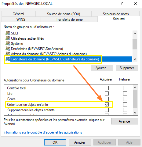 4 - Désormais, vérifiez si le groupe Utilisateurs authentifiés ("Authenticated Users") dispose du droit Créer tous les objets enfants ("Create all child objects").