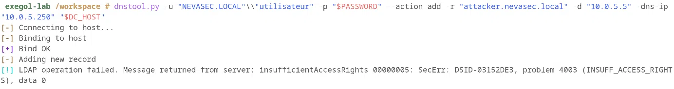 - Vérifier qu’un utilisateur standard ne peut plus ajouter d’enregistrement DNS. Par exemple avec dnstool.py exécuté en tant qu’utilisateur standard de l’AD. Autrement dit, le test effectué précédemment ne devrait plus fonctionner !
