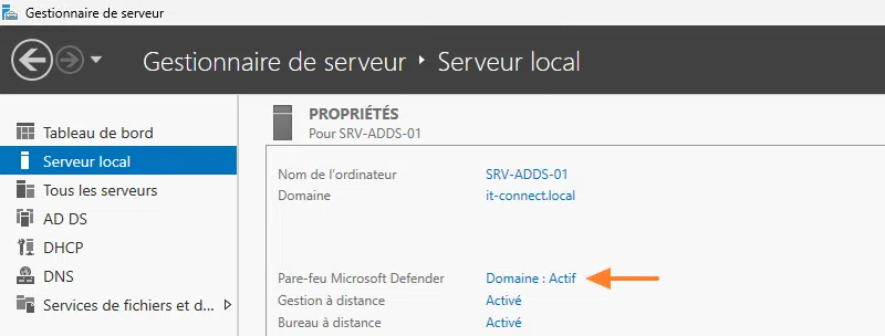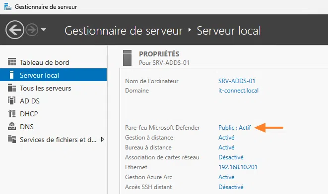 Il s'agit d'un problème fréquemment rencontré en environnement Active Directory. À partir du Gestionnaire de serveur, vous pouvez constater l'état suivant : Pare-feu Microsoft Defender - Public : Actif. Cependant, la connexion devrait être de type "Domaine" (Réseau avec domaine).
