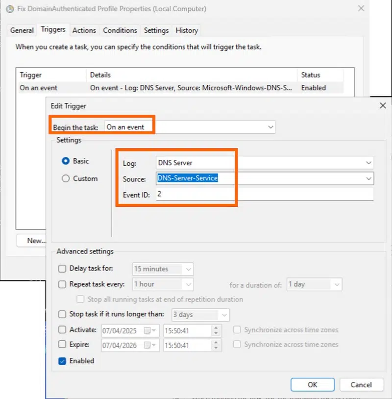 Puis, vous devez configurer un nouveau déclencheur sur un évènement. Ici, nous allons déclencher la tâche lorsqu'un événement avec l'ID 2 sera détecté dans le journal DNS Server de la machine locale.