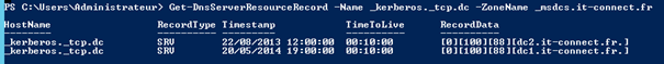 Get-DnsServerResourceRecord -Name _kerberos._tcp.dc -ZoneName _msdcs.it-connect.fr