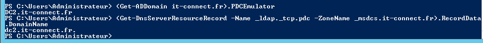 $DnsPdc = (Get-DnsServerResourceRecord -Name _ldap._tcp.pdc -ZoneName _msdcs.it-connect.fr).RecordData.DomainName
