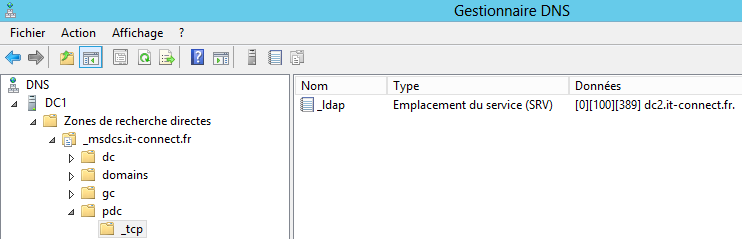 Zones de recherche directes > _msdcs.it-connect.fr > pdc > _tcp