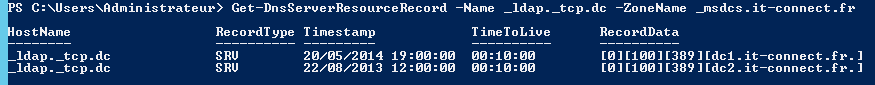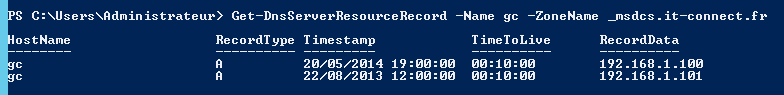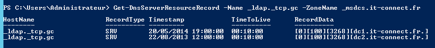 Get-DnsServerResourceRecord -Name _ldap._tcp.gc -ZoneName _msdcs.it-connect.fr