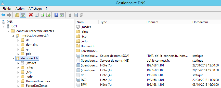 Zones de recherche directes > _msdcs.it-connect.fr > dc > _tcp