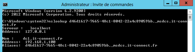 Si le GUID du contrôleur est « d46d1617-7665-48c1-8042-22a4c89059bb » on pourra grâce à nslookup et à l’alias CNAME retrouver l’adresse IP du serveur :