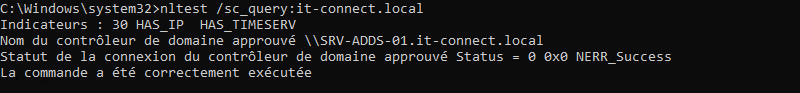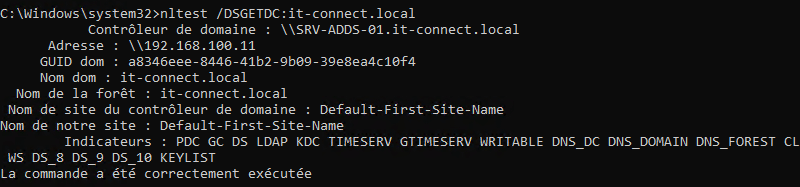 En retour, j'obtiens le nom du contrôleur de domaine sur lequel je me suis authentifié, à savoir "SRV-ADDS-01" :