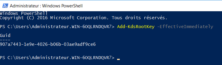 Pour créer une clé à partir du contrôleur de domaine, nous allons utiliser PowerShell et le cmdlet Add-KdsRootKey.