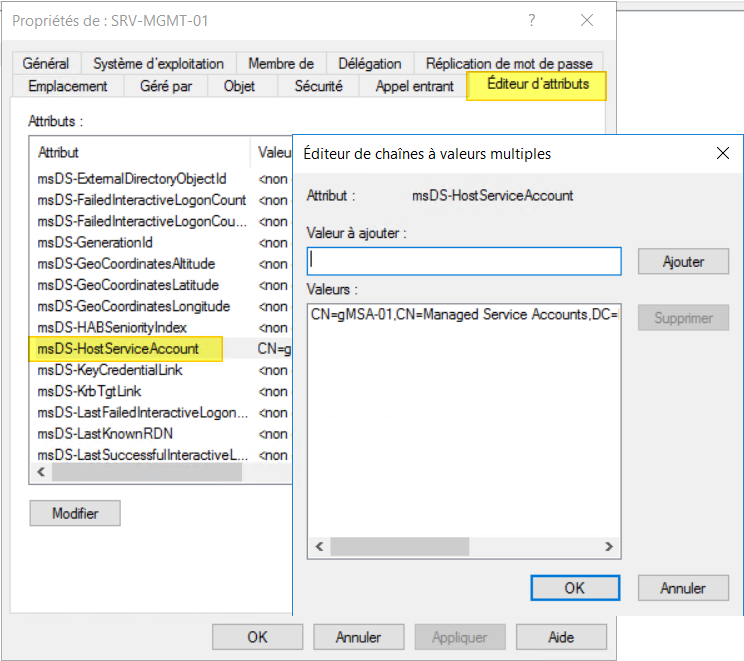 Si l'on regarde notre objet ordinateur dans l'AD, à savoir l'objet SRV-MGMT-01, on peut voir qu'il y a eu une modification de l'attribut msDS-HostServiceAccount. Cet attribut contient désormais une valeur correspondante à notre gMSA gMSA-01.