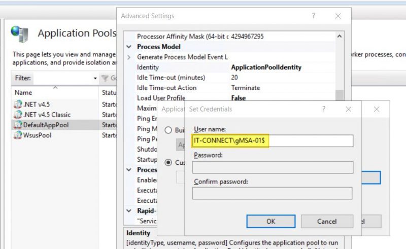 La dernière étape consiste à l'associer à votre tâche planifiée, votre service, etc... Par exemple, on peut l'utiliser sur un pool d'applications IIS. Ce qui est important, c'est de bien laisser le champ mot de passe vide quand vous utilisez un gMSA. Autre chose importante, quand vous indiquez le nom du compte gMSA, pensez à ajouter un "$" à la fin et en préfixe le nom NETBIOS du domaine. Pour le compte gMSA gMSA-01, cela donne le nom complet suivant :