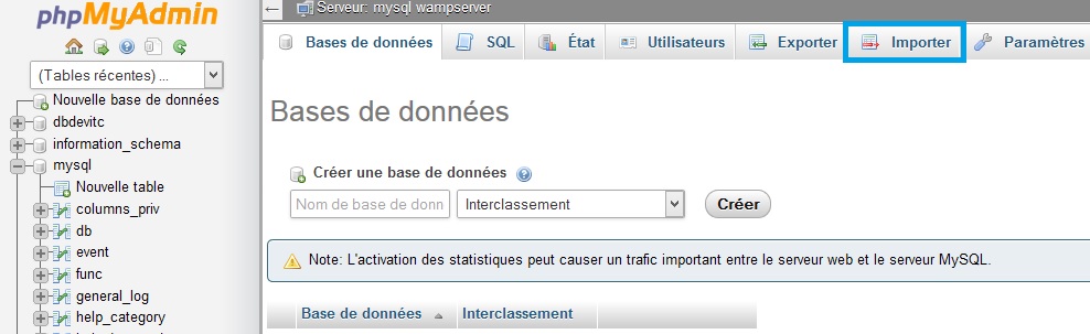 Après avoir enregistré ces modifications, nous allons importer un fichier au format SQL qui va permettre à phpmyadmin d'avoir sa propre table, contenant ses informations de configuration. On va pour cela à la racine de l'interface web de PhpMyAdmin puis cliquer sur "Importer" :