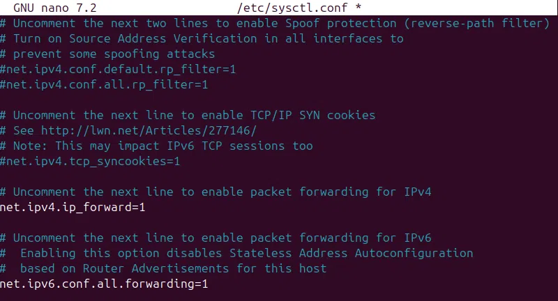 Pour activer ces changements de manière permanente, il faut aller modifier le fichier de configuration de sysctl pour qu'il charge nos modifications à chaque démarrage. Cette phrase fait référence au fichier "/etc/sysctl.conf". Pour activer l'IP forwarding de façon permanente, nous allons modifier ce fichier afin de décommenter deux lignes :