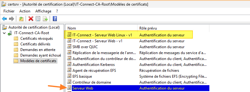 La suite des opérations va être effectuée à partir du serveur AD CS (ou d'un serveur disposant des outils d'administration nécessaires). Vous devez disposer d'un modèle de certificat adapté pour "Serveur Web" avec le rôle "Authentification du serveur" pour délivrer le certificat TLS.
