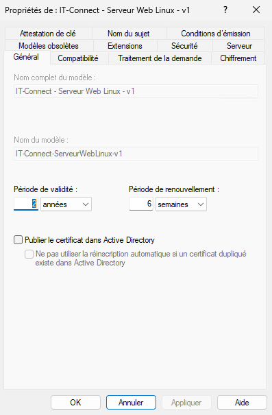 Dans la console AD CS (certsrv), vous pouvez dupliquer le modèle natif "Serveur Web", via la section "Modèles de certificats" puis "Gérer". Vous devez ensuite l'ajouter à la liste des modèles publiés. Si besoin, référez-vous à notre cours dédié à AD CS pour obtenir de l'aide à ce sujet.