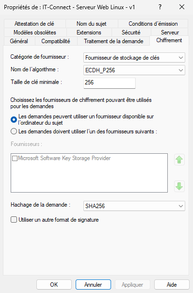 Ensuite, via l'outil certreq vous pouvez demander un certificat en ciblant le modèle IT-Connect-ServeurWebLinux-v1 (adaptez avec votre nom) et en spécifiant le fichier CSR.