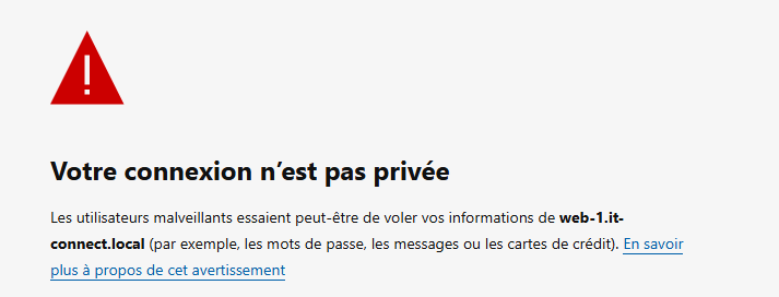 L'objectif sera de délivrer un certificat TLS valide pour les connexions HTTPS vers ce site web : https://web-1.it-connect.local. Actuellement, le certificat n'est pas reconnu, car il s'agit d'un certificat auto-signé.