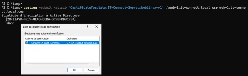 certreq -submit -attrib "CertificateTemplate:IT-Connect-ServeurWebLinux-v1" .\web-1.it-connect.local.csr web-1.it-connect.local.cer