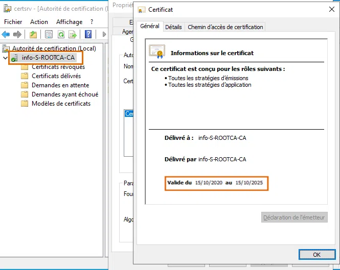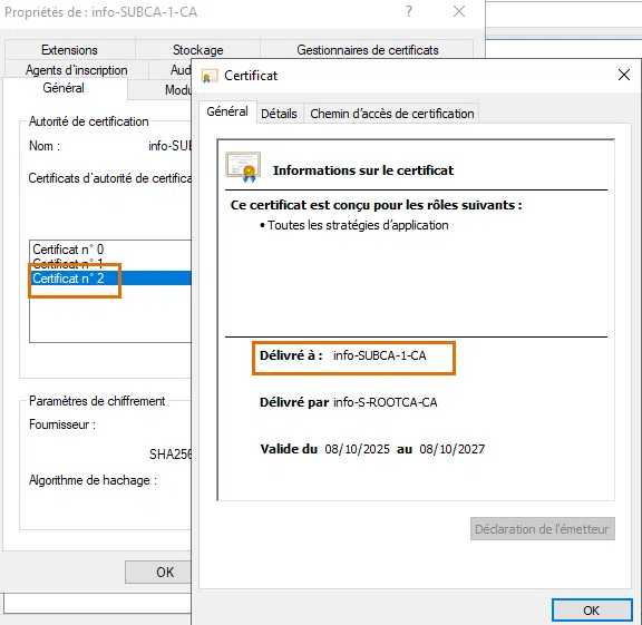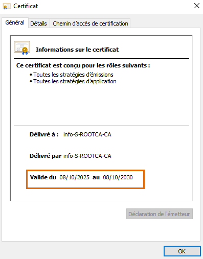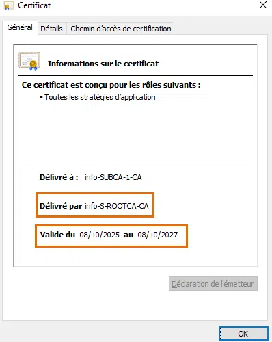 Vous pouvez constater que le nouveau certificat intermédiaire a bien été émis par l’autorité racine, sa durée de validité est généralement inférieure à celle du certificat racine, ce qui est normal dans une architecture hiérarchique.