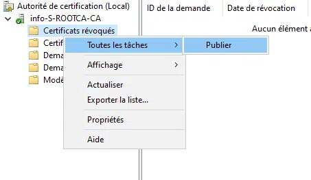 Pour cela, effectuez un clic droit sur "Certificats révoqués", puis sélectionnez "Publier".