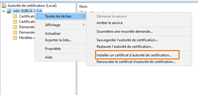 Ouvrez le gestionnaire du certificat, effectuez un clic droit sur la CA, et choisissez l’option « Installer un certificat d'autorité de certification… ».