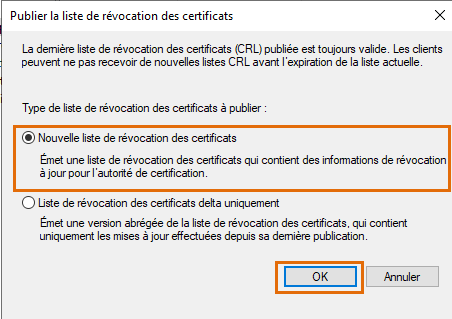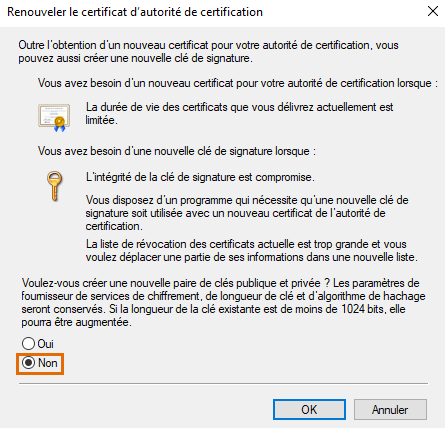 Attention : si vous changez la paire de clés de la CA, vous devrez aussi recréer la liste de révocation pour l’OCSP. Ceci est précisé dans la documentation de Microsoft.