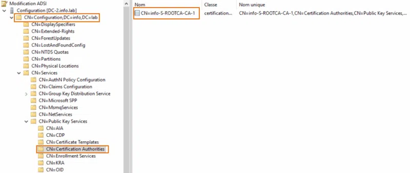 À ce stade, nous venons de renouveler le certificat d’autorité hors ligne et de le publier dans Active Directory. Vous pouvez vérifier dans la partition "Configuration" que ce dernier a bien été inscrit.