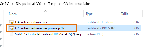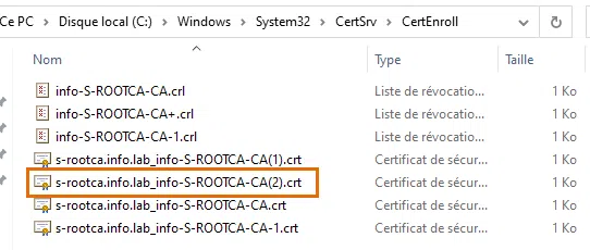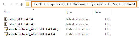 Les certificats sont également accessibles depuis le répertoire par défaut du serveur, un emplacement pratique pour récupérer la liste de révocation CRL ou publier le CER. Accédez à ce répertoire :