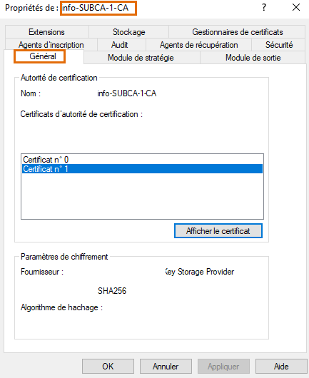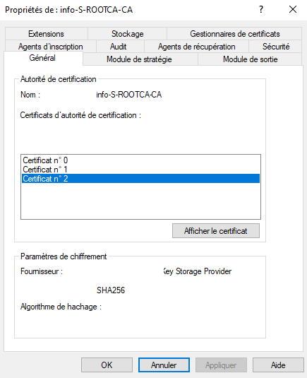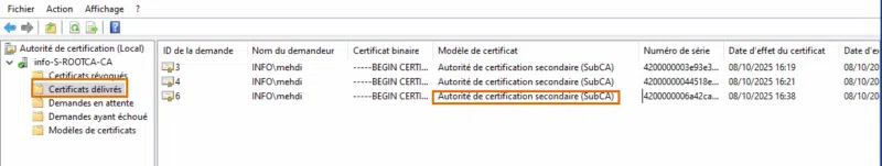 Nous poursuivons les actions après cette courte parenthèse. En attendant quelques secondes, le nouveau certificat d’autorité est généré et le service de certification redémarre automatiquement. Vous pouvez ensuite vérifier la présence du nouveau certificat dans la console : il apparaîtra avec un indice incrémental (dans notre cas, n°1) pour le distinguer de l’ancien.