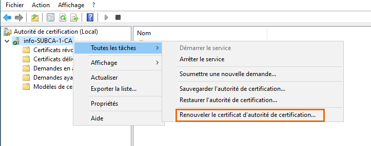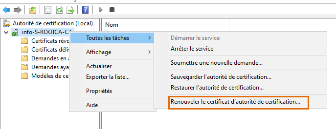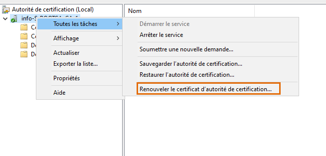 Depuis la console Autorité de certification, effectuez un clic droit sur le nom de votre autorité, puis sélectionnez "Toutes les tâches", et l'action "Renouveler le certificat d’autorité de certification".