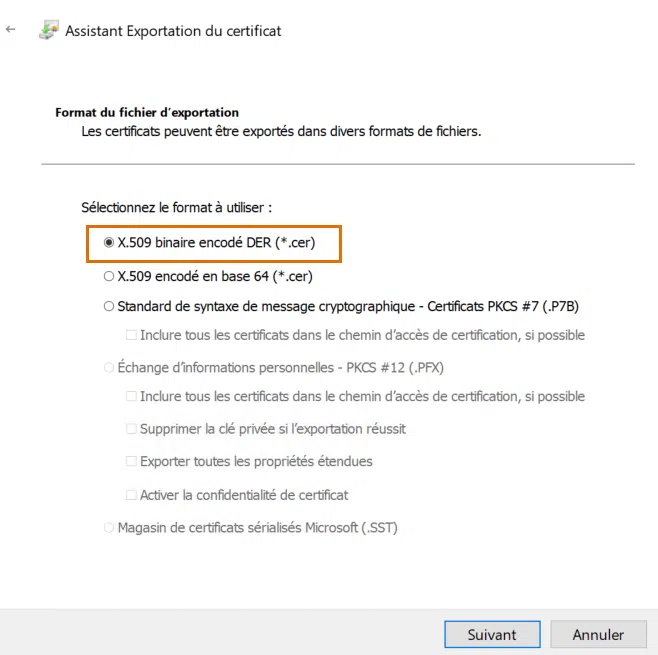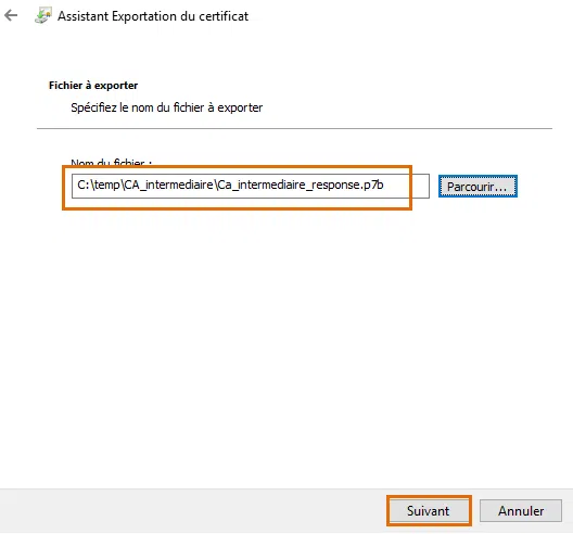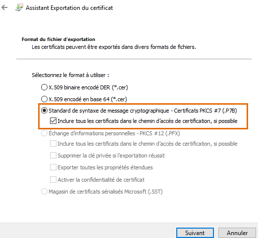 Dans l’assistant d’exportation, cochez l’option faisant référence à Standard PKCS#7 (.p7b) ainsi que l’option "Inclure tous les certificats dans le chemin d’accès de certification, si possible".