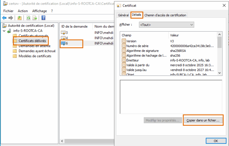 Sélectionnez le certificat récemment généré, dans l'onglet "Détails" cliquez sur "Copier dans un fichier".