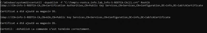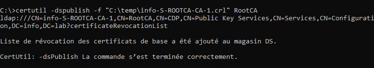 N'oubliez pas de lancer la commande avec un compte ayant les droits d'inscrire des CRL dans l'AD, en l'occurrence Admin du domaine.