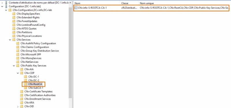 Si tout s’est déroulé correctement, vous devriez retrouver les informations liées à la liste de révocation (CRL) directement dans ADSI Edit, confirmant ainsi leur publication dans Active Directory.