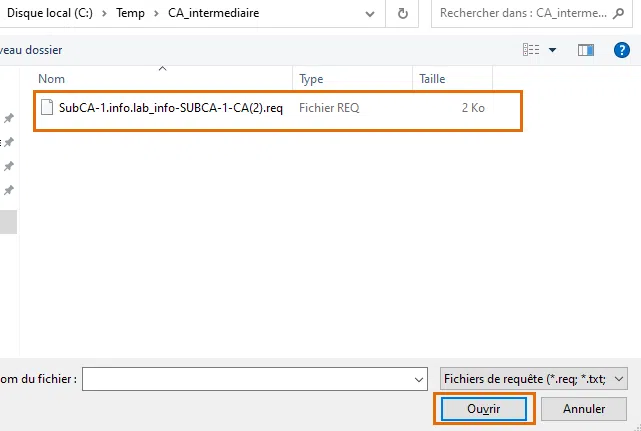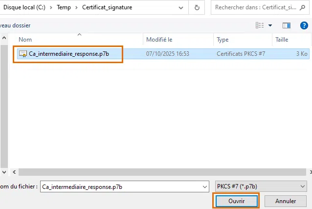 Choisissez votre demande de certificat et cliquez sur "Ouvrir".